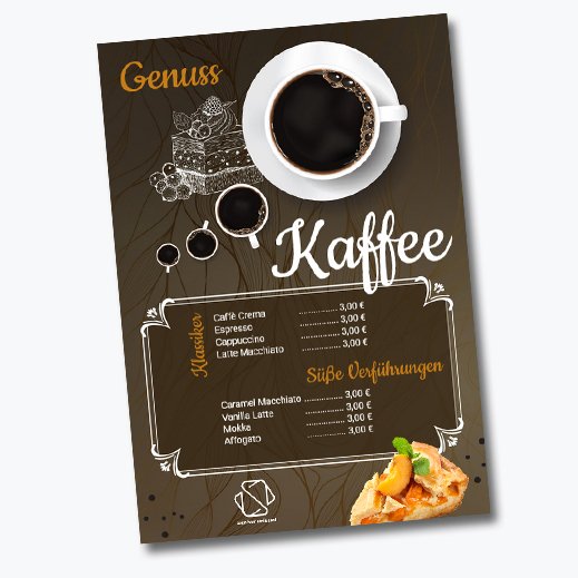 Mit unseren Vorlagen gestaltet ihr euer Plakat in wenigen Minuten – ganz nach euren Wünschen. Preise, Specials und kleine Extras wie Rabatte für Kombi-Bestellungen fügt ihr einfach ein. So zeigt ihr auf einen Blick, was eure Gäste erwartet. Und wer kann schon einem Stück Kuchen widerstehen?