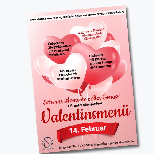 Nutzen Sie unsere praktischen Online-Vorlagen, um Ihre Valentinsangebote professionell zu bewerben. Ob gedruckt oder als digitale Datei – wir bieten Ihnen die perfekte Lösung für Ihre Werbung. Starten Sie jetzt und sichern Sie sich mehr Sichtbarkeit zum Valentinstag!